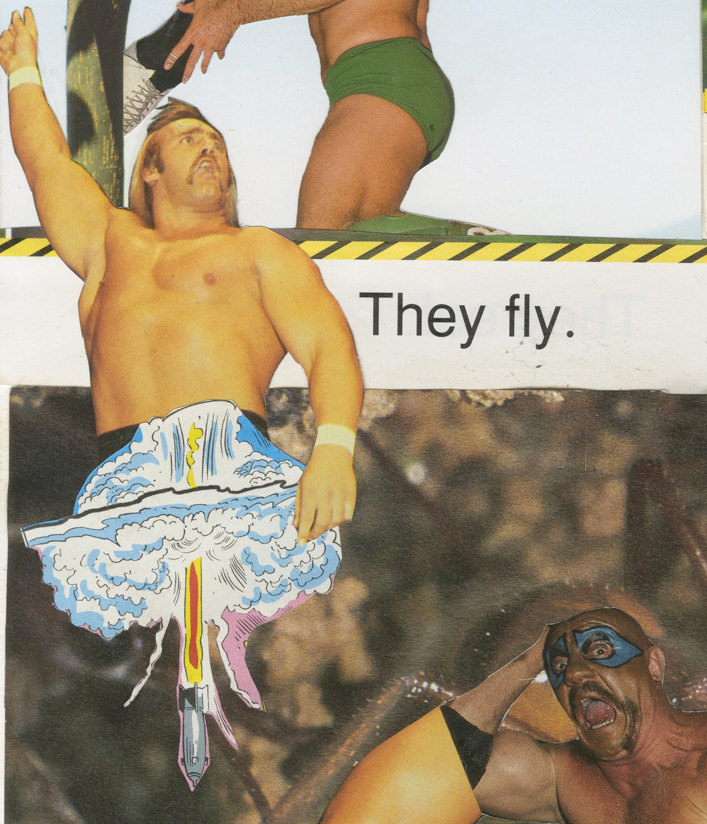 recently rediscovered these collages i made in 2017. combining wrestling magazine images w/ images from a nature magazine w/ speech bubbles from a comic book (can’t remember which). art should be a little funny..lesson from mr. michael hurley. a little funny, maybe a little homoerotic too.